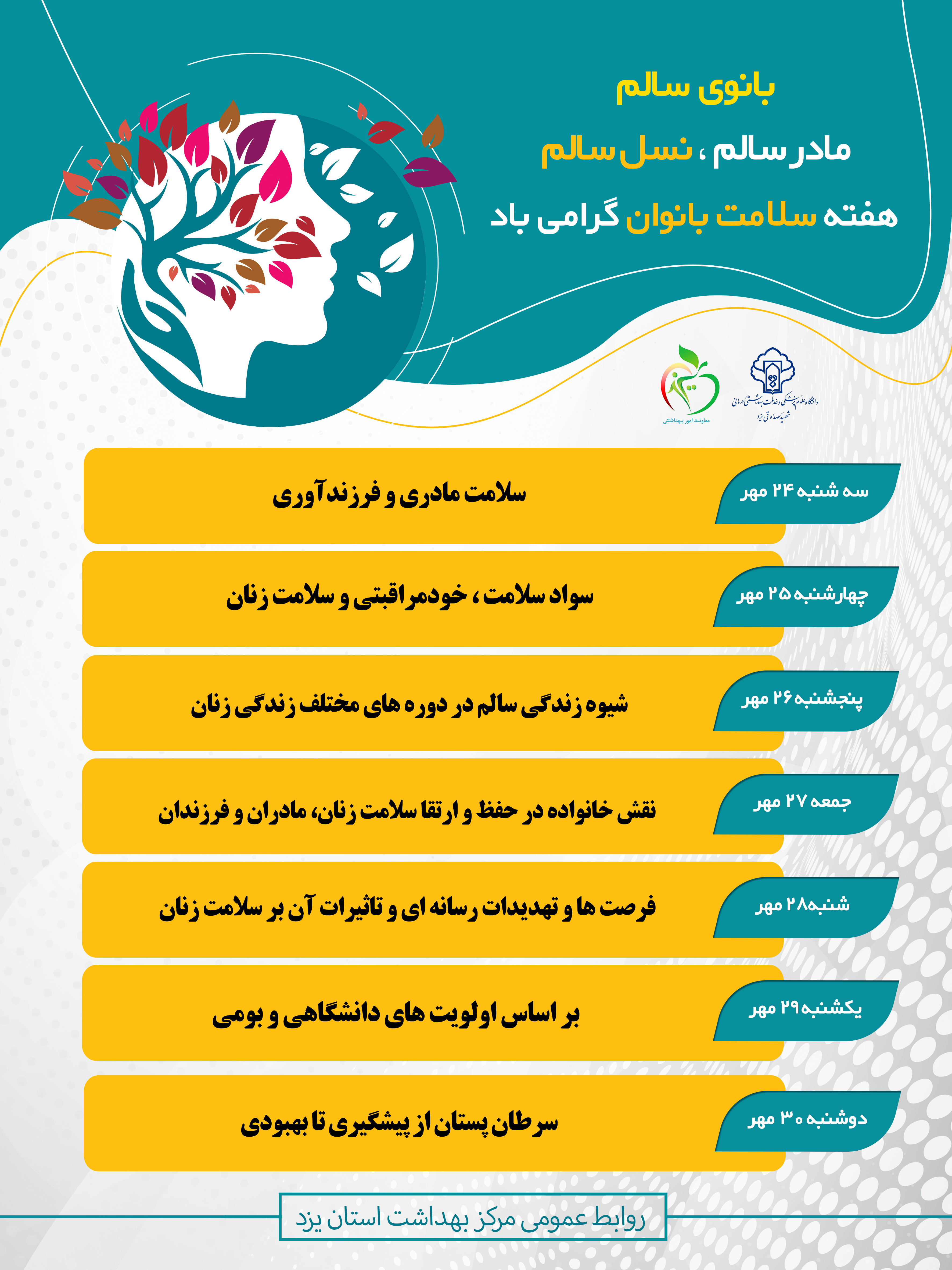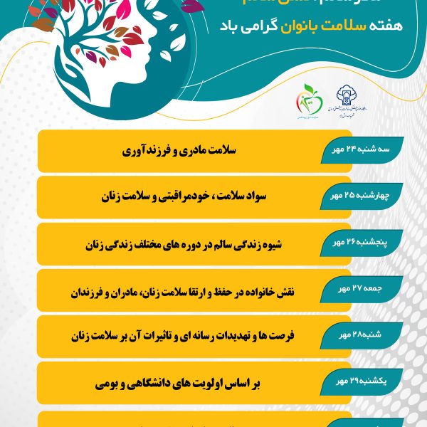 🔹فرا رسیدن ۲۴ مهرماه، آغاز هفته ملی بانوان، فرصتی مغتنم است تا از تلاش‌ها و نقش بی‌بدیل بانوان در جامعه قدردانی کنیم. بانوان به عنوان محور خانواده و جامعه، نقشی اساسی در ارتقای سلامت و بهبود کیفیت زندگی ایفا می‌کنند.