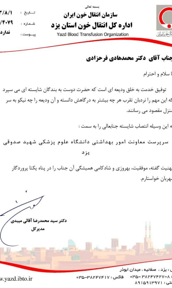 مدیرکل انتقال خون استان، انتصاب دکتر محمدهادی فرحزادی را تبریک گفتکارشناس روابط عمومی5 آبان 1403🔹️ دکتر سید محمدرضا آقائی میبدی، مدیرکل انتقال خون استان یزد، در پیامی ... اطلاعات بیشتر